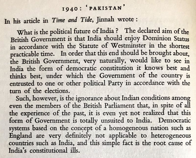 Now let’s turn our attention to my central point. In referencing this book, my intention is to to point out a very astute observation Jinnah makes about western democracy during the process of negotiating the formation of Pakistan. First to give some context, Bolitho attempts to get into Jinnah’s head by way of quoting from two published articles in English journals from 1940. Here are the direct quotes: