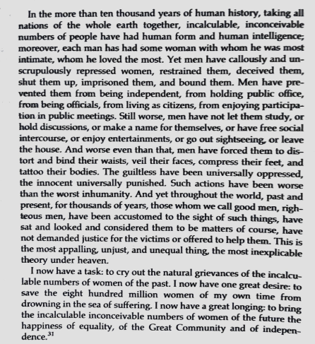 Also I think it is worth mentioning that what Kang wanted was equality for all, freedoms of all types and generally a very democratic society, but he thought this was an eventual destination that China would one day reach, but it would take time. Here’s a taste of Kang’s writing about women in his seminal work “Book of the Great Community” (or “Great Unity” as it is known in other circles):