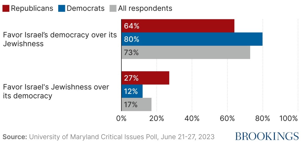 First, in the absence of a two-state solution to the Israeli-Palestinian conflict, about three-quarters of Americans, including 80% of Democrats and 64% of Republicans, would choose a democratic Israel that’s no longer Jewish, over a Jewish Israel without full citizenship and equality for non-Jews living under its authority.